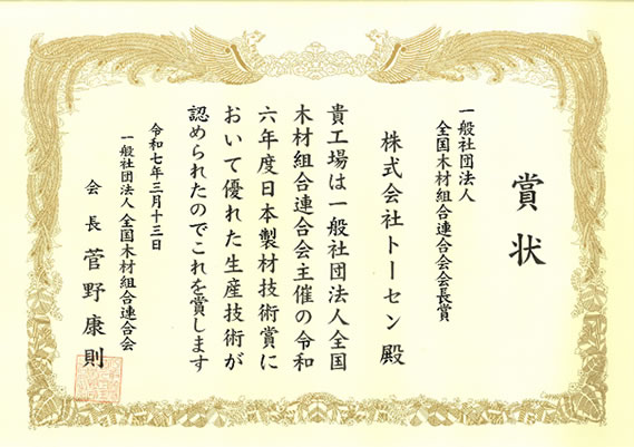 令和6年度日本製材技術賞 一般社団法人全国木材組合連合会会長賞 を受賞いたしました。 2025.03.13 令和6年度日本製材技術賞 一般社団法人全国木材組合連合会会長賞 を受賞いたしました。 製材を生産する工場の生産性や独自性、品質向上の取組み、雇用環境の整備等、多岐にわたる製材工場の生産技術を審査し表彰するもの とのことで、弊社の取り組みが評価されたこと、光栄であり、嬉しく思います。 令和6年度日本製材技術賞 令和6年度日本製材技術賞 一般社団法人全国木材組合連合会会長賞 を受賞いたしました。 2025.03.13